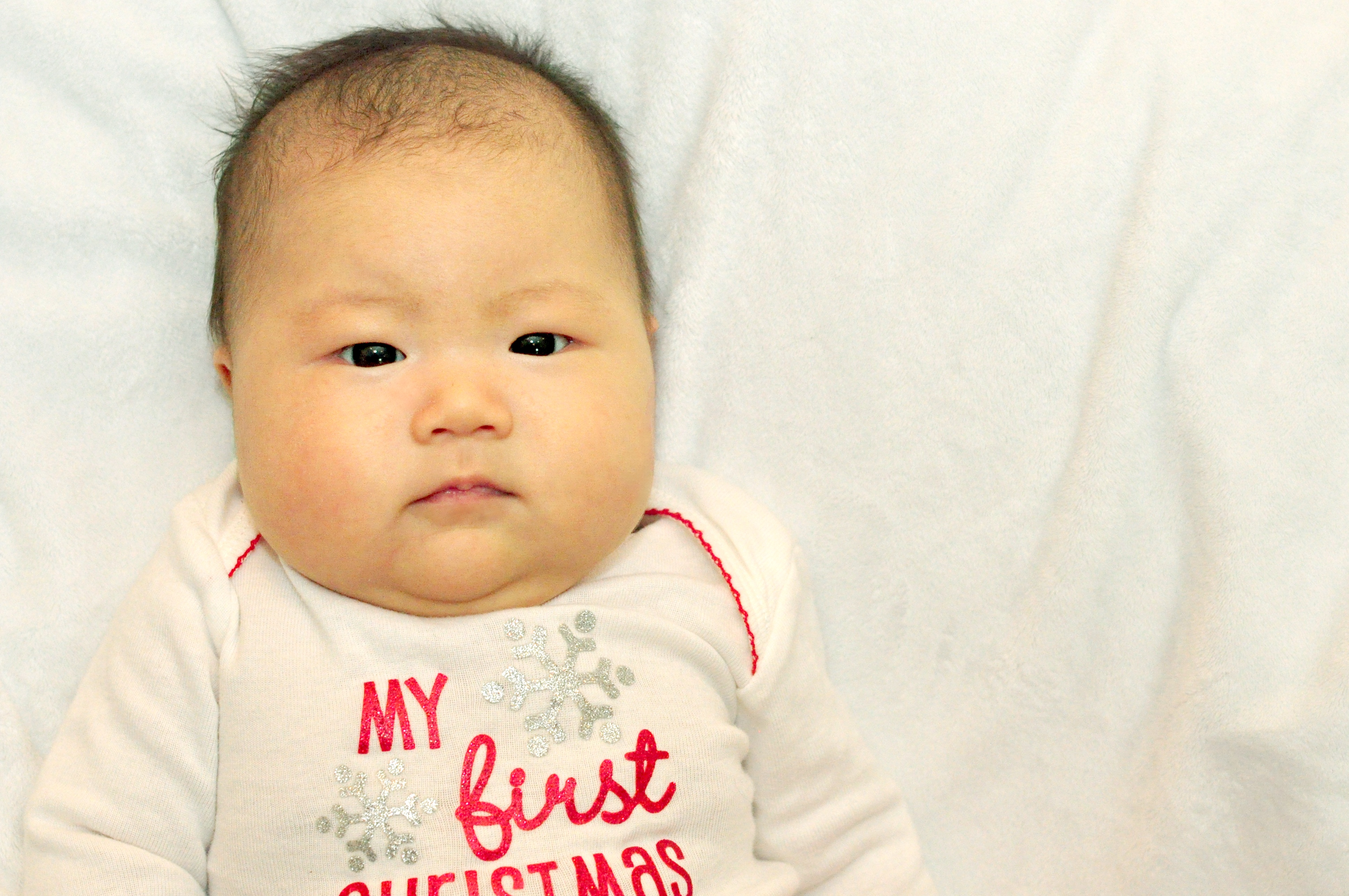 • Sleeping – Nighttime sleep is still pretty good.  We’ve gradually moved her bedtime earlier and earlier, and her bedtime throughout month 3 was typically 7:30pm.  Just 2 days ago, I experimented with moving it even earlier, and I’m happy to say that now she goes down at 6:30pm!  Unfortunately, daytime naps are still a struggle.  All the activity during the holidays made it difficult to establish a regular naptime schedule so her naps are still all over the place.  I just started her on a schedule in the new year so hopefully this will help get her to nap longer and more regularly.