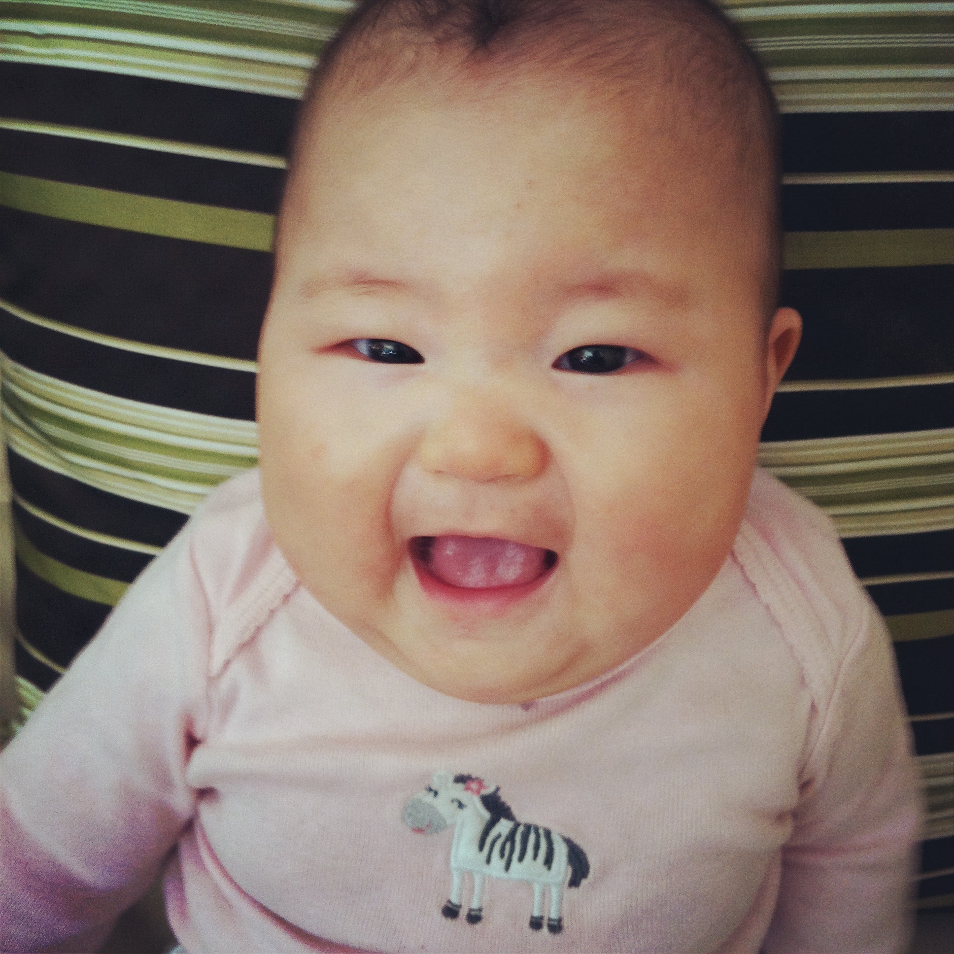 Eating: The rolls are as rolly as ever, though she’s stretching out more so they aren’t as prominent compared to her early months.  We started solids a week before she turned 6 months.   I tried waiting until she officially reached the half year mark but felt bad because I could tell she was developmentally ready and eager to try something other than breastmilk.  How did I know?  Well, every time we’d eat in front of her, she’s crane her head, following our spoons and opening her mouth, with the most eager and curious expression on her face.  I knew then it was time. From the moment she took her first bite, she was was a champ – unlike most babies with their first taste of food, she didn’t dribble food out of her mouth with a quizzical expression on her face.  Every single bite went down.  Hubs and I were amazed,