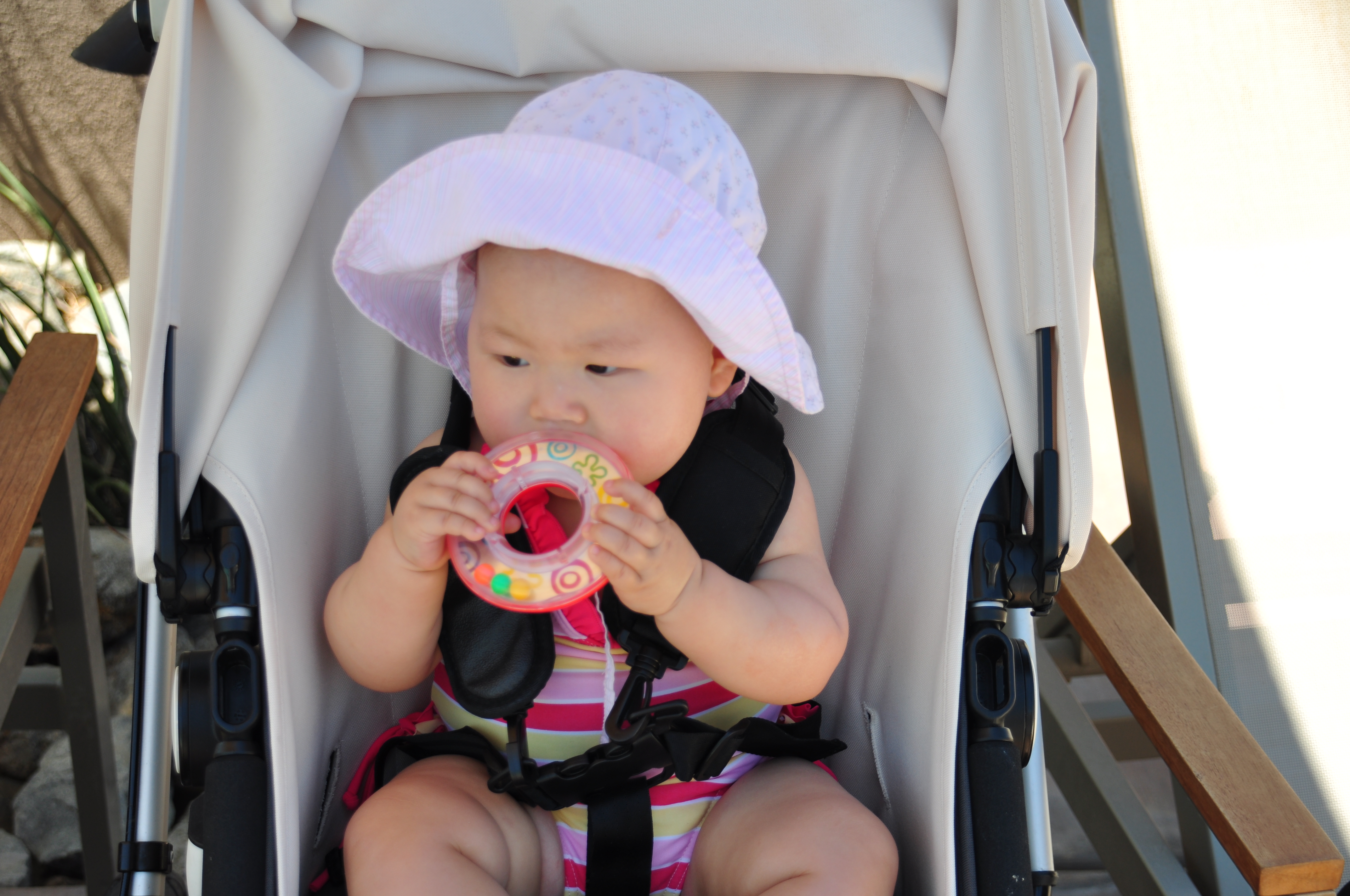 Sleep:  Not much has changed – naps were still a bit inconsistent in terms of timing and duration, but I tried establishing a routine at least for her morning nap, so this month she was going down at 9am and at times without a fuss.  She was usually nursed to sleep when I was home but I’ve been trying to break that habit over the last few months and we were starting to see some progress.  I nursed her down, usually when she was overtired, but she was starting to get the hang of soothing herself to sleep with the help of her paci and soother.  Bedtime was still 6:30pm-ish unless we’re out somewhere, with one nighttime waking between 2-4am.
